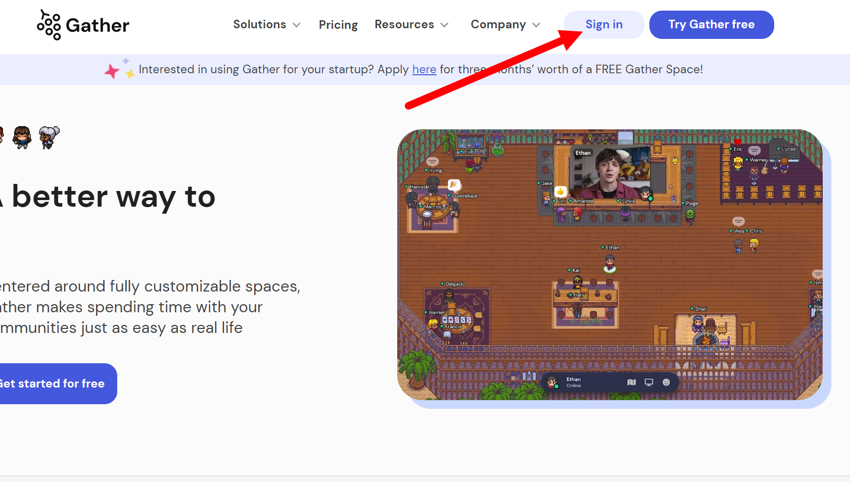 1)게더타운 홈페이지 상단에서 sign in으로 이동합니다.