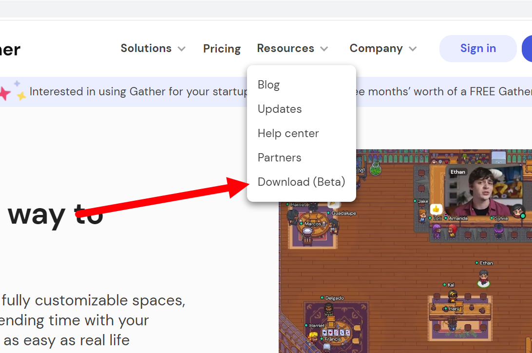 1)게더타운 홈페이지 상단에서 sign in으로 이동합니다.