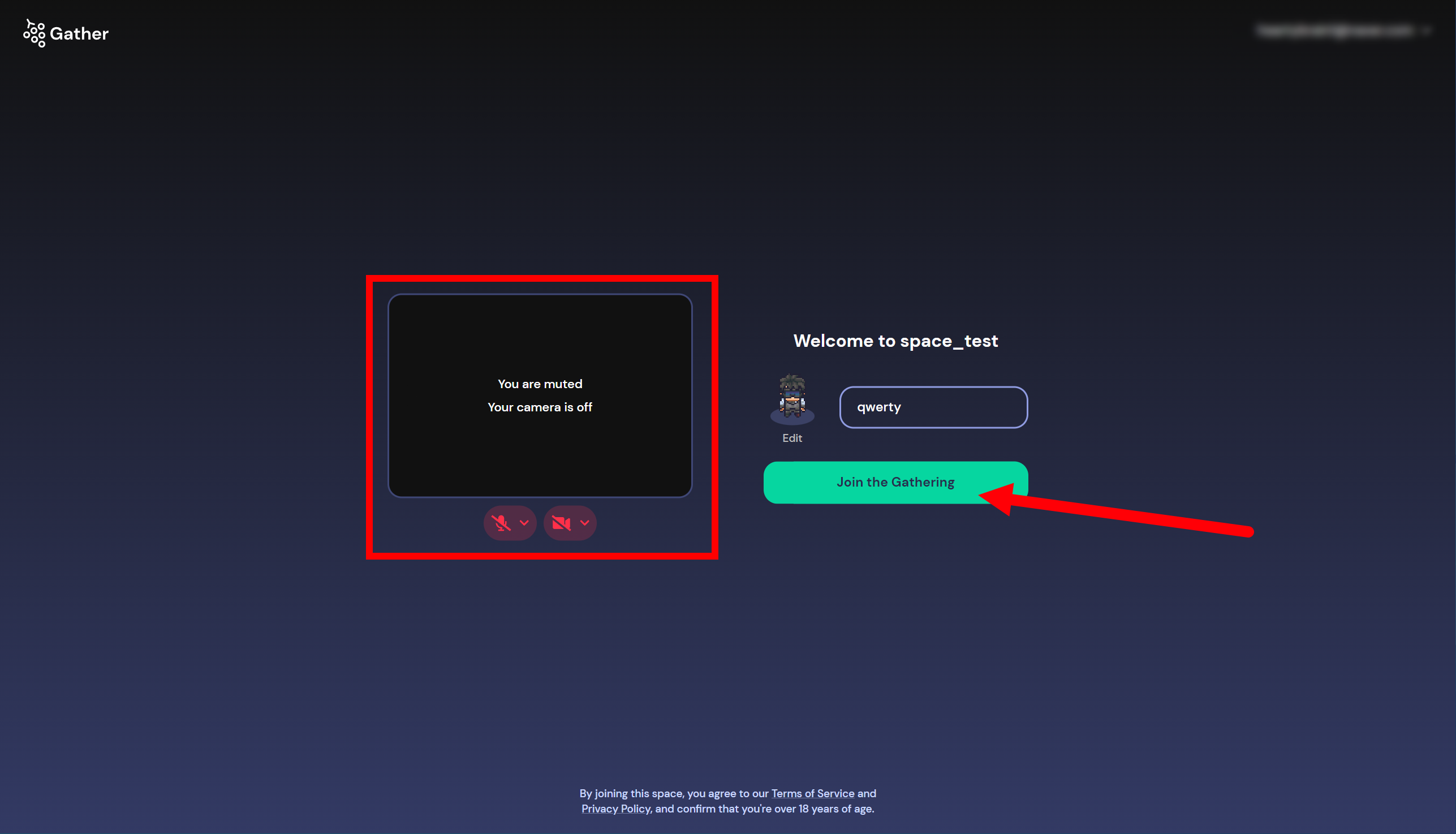 7)카메라 및 마이크 상태를 확인하고 join the gathering을 클릭합니다.