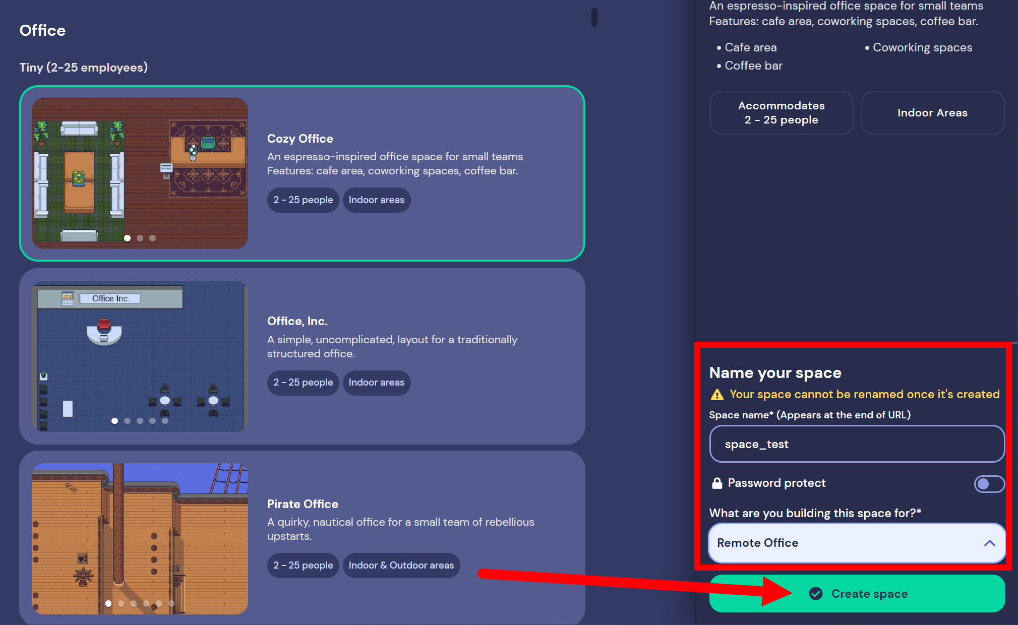 6)우측 하단에서 공간의 이름 및 비밀번호(선택사항)를 설정하고 공간의 사용목적을 선택한후 create space를 클릭합니다.