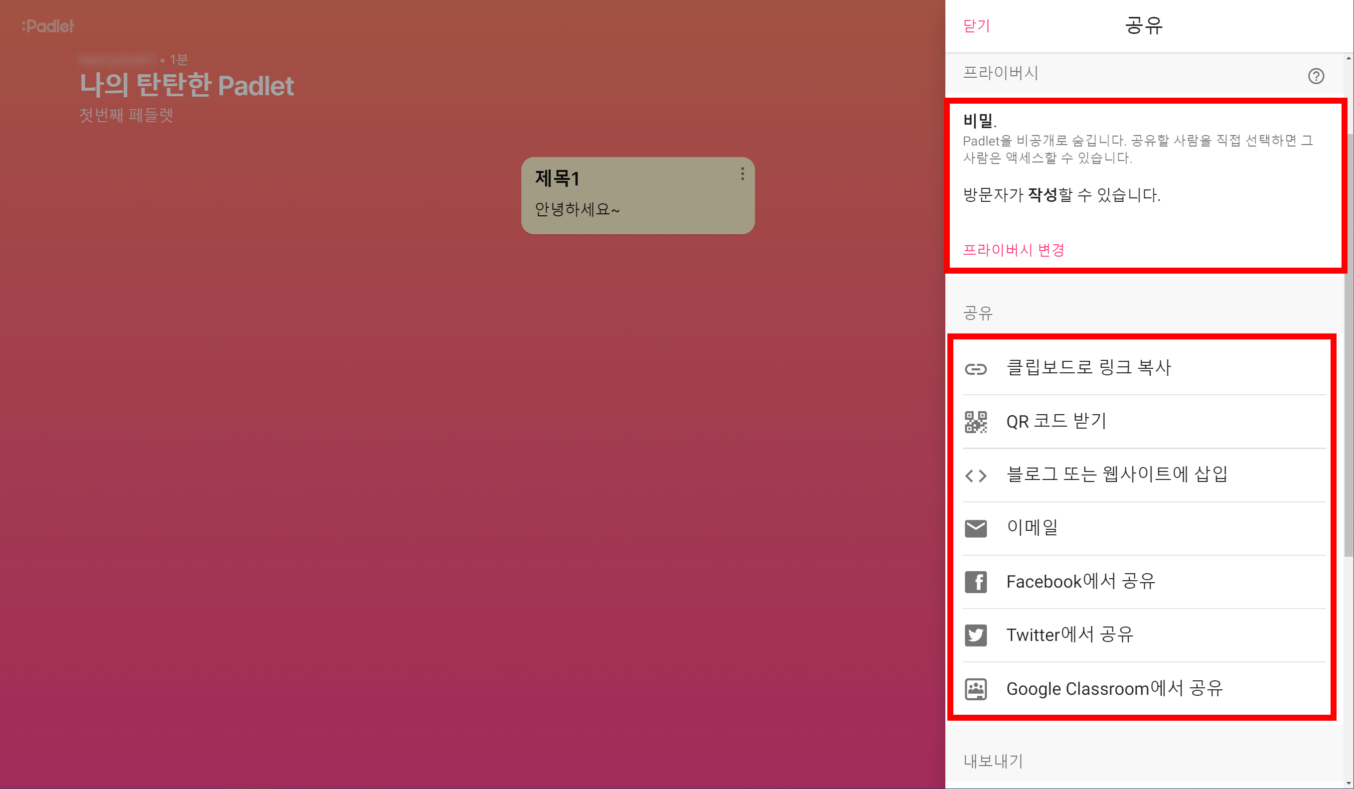 11)프라이버시를 설정하고 다양한 방법으로 패들렛을 공유할수있습니다. 예를들어 클립보드로 링크복사를 선택하고 해당 링크를 공유하면 링크를 공유받은 사람이 패들렛에 접근할수있습니다.
