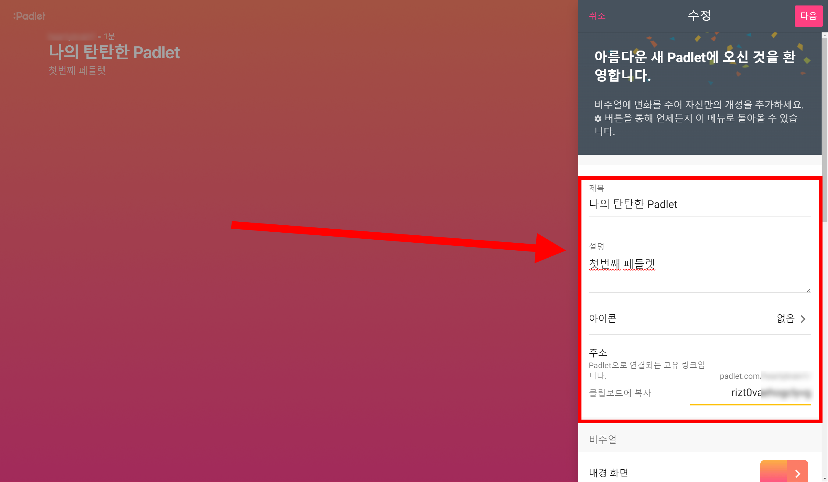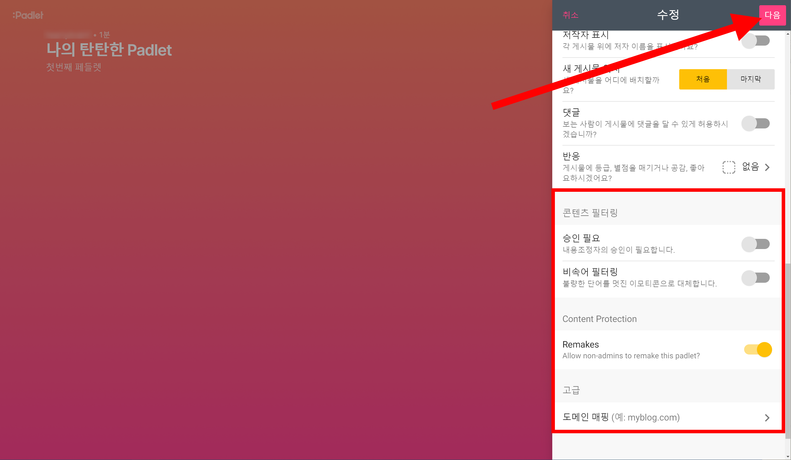 4)패들렛의 제목, 설명, 배경화면, 글꼴, 댓글, 콘텐츠필터링 기타등을 설정하고 다음으로 이동합니다.