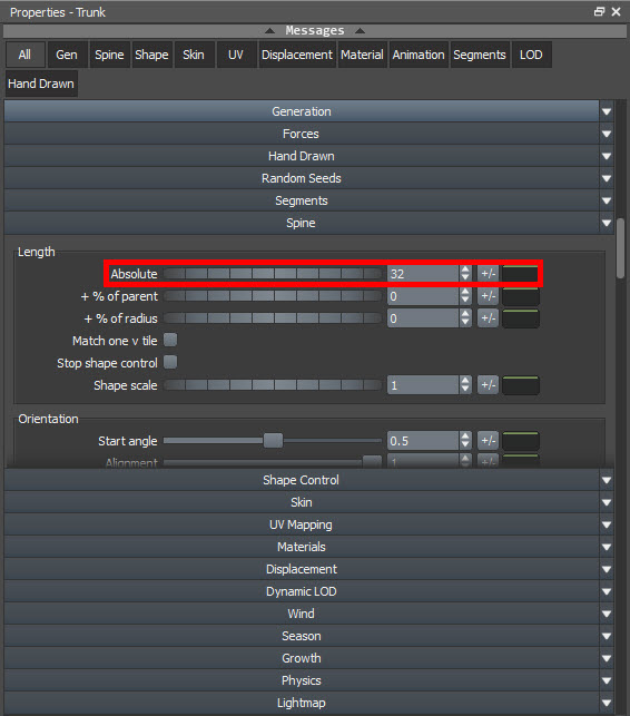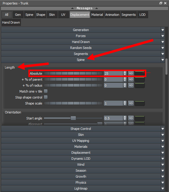 4)나무 줄기의 높이를 설정하려면 trunk 제너레이터를 선택하고 속성(properties) 윈도우에서 spine으로 이동합니다. length의 absolute 에서 줄기의 높이가 기본값 25으로 설정되어있는것을 확인할수있습니다.
