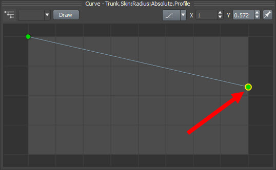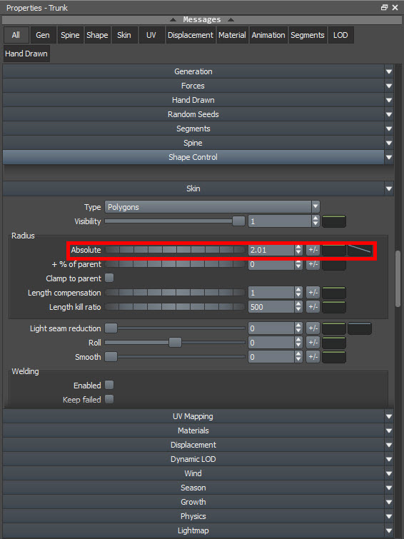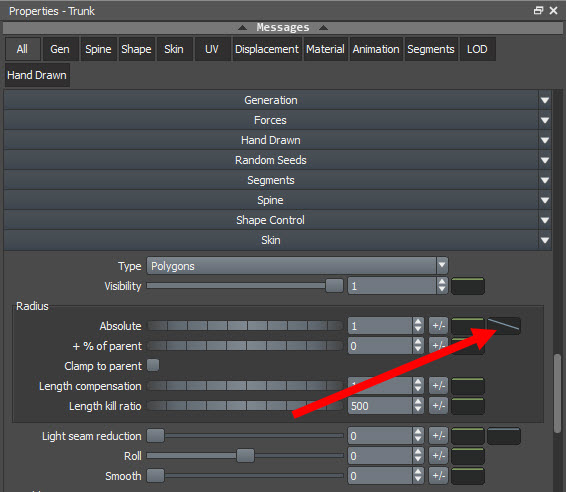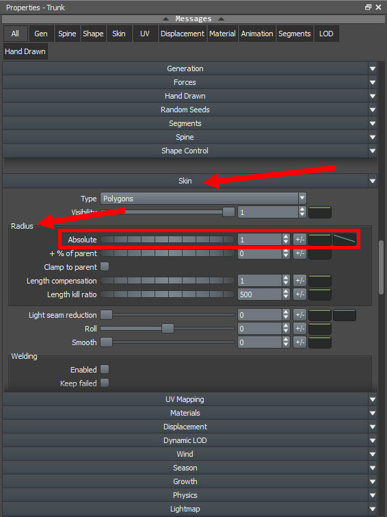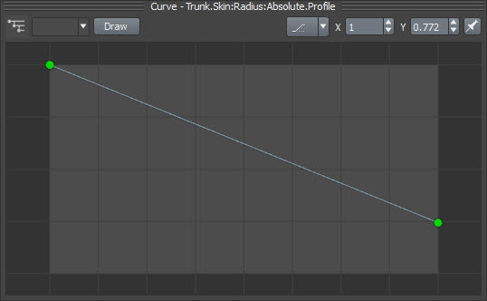 8)trunk의 속성에서 skin으로 이동합니다. radius의 absolute 수치가 기본값 1로설정되어있는것을 확인할수있습니다.