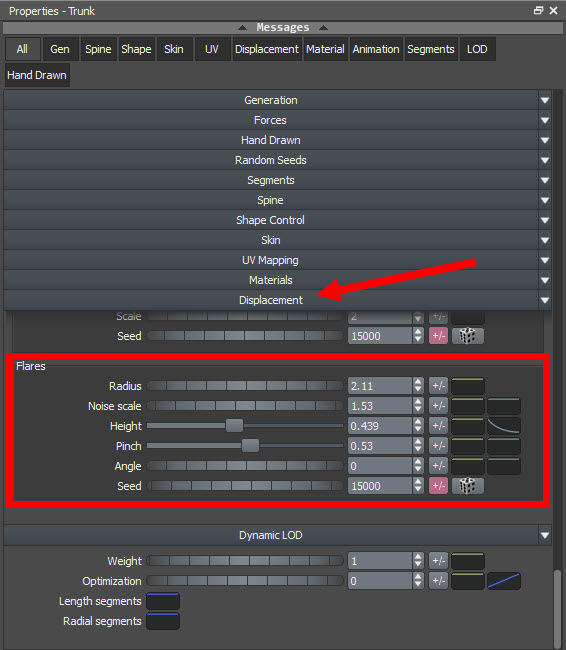 14)displacement의 flares에서 radius, height, pince등의 속성을 설정하여 나무 줄기의 밑을 모델링합니다.