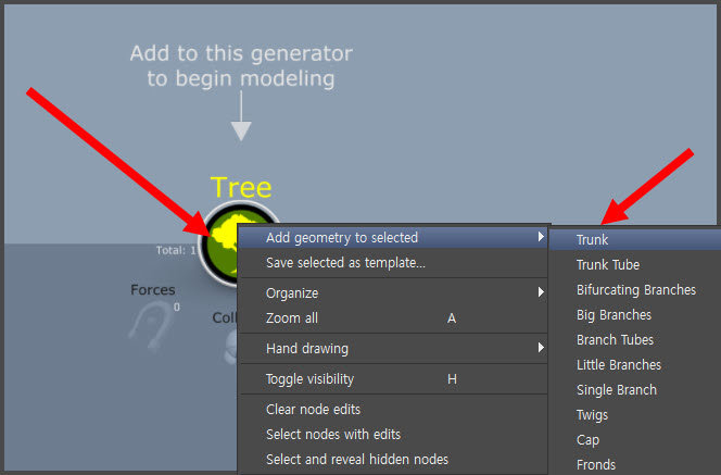 1)새로운 나무 모델의 줄기를 생성하기위해 generation 윈도우에서 tree 제너레이터를 선택하고 마우스 우클릭한후 add geometry to selected의 trunk를 선택합니다.