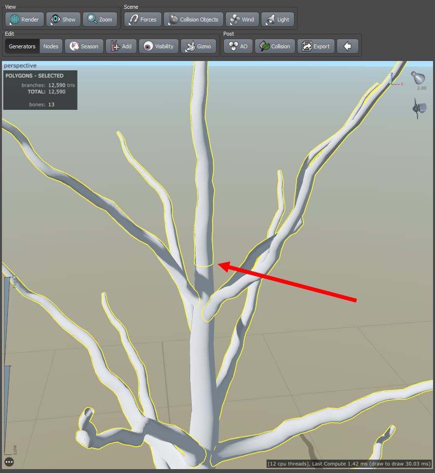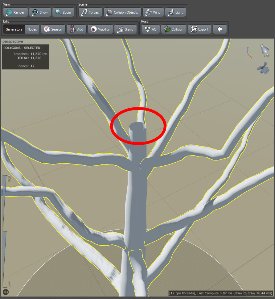 스피드트리(speedtree)에서 나무 모델링 - 나무 줄기(trunk)의 상단 구멍 제거하고 연장하기