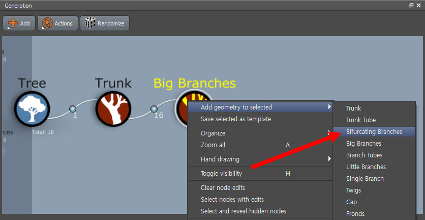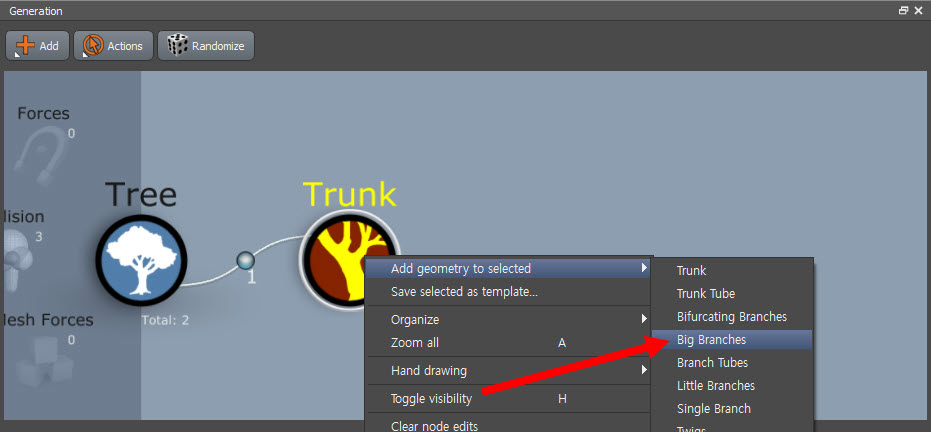 3)생성한 trunk 노드를 선택하고 big branches 제너레이터를 추가합니다.