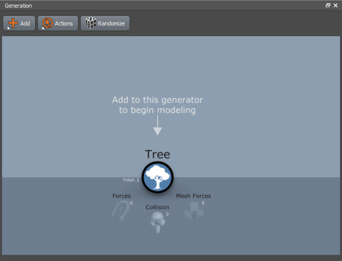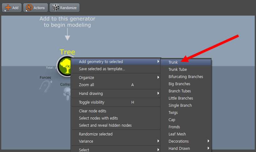 1)generation 윈도우에서 tree 제너레이터를 선택하고 마우스 우클릭한후 add geometry to selected의 trunk를 선택합니다.