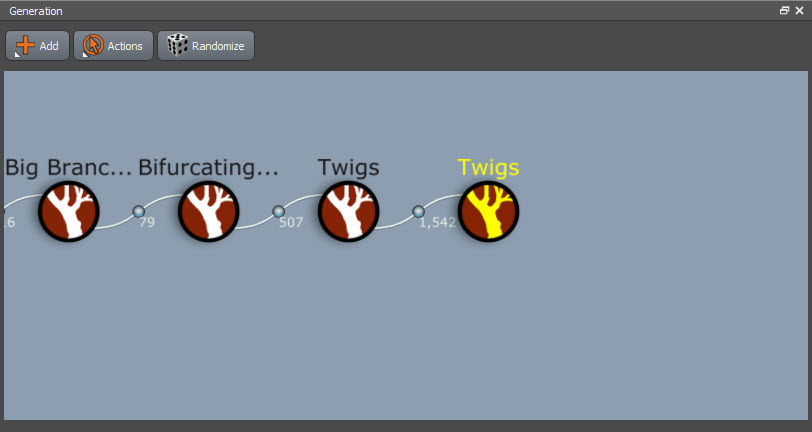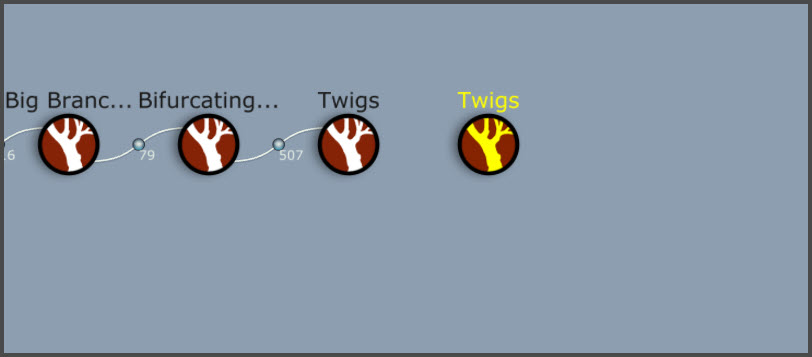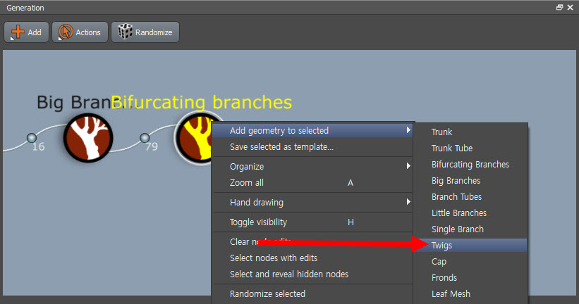 7)생성한 branch 노드(bifurcating branches)를 선택하고 twigs 제너레이터를 추가합니다.