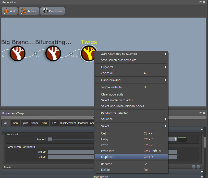 9)twigs 노드를 선택하고 마우스 우클릭한후 duplicate를 선택합니다(단축키 ctrl+d)
