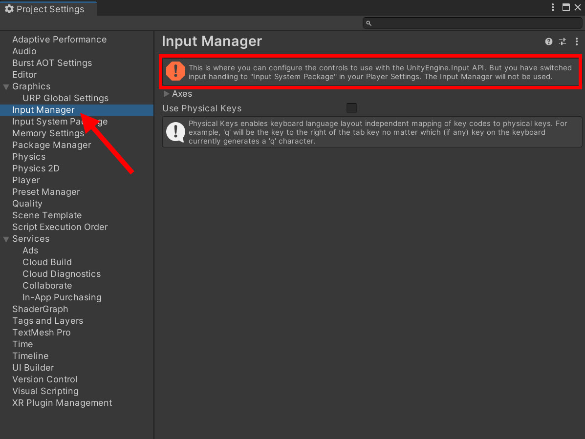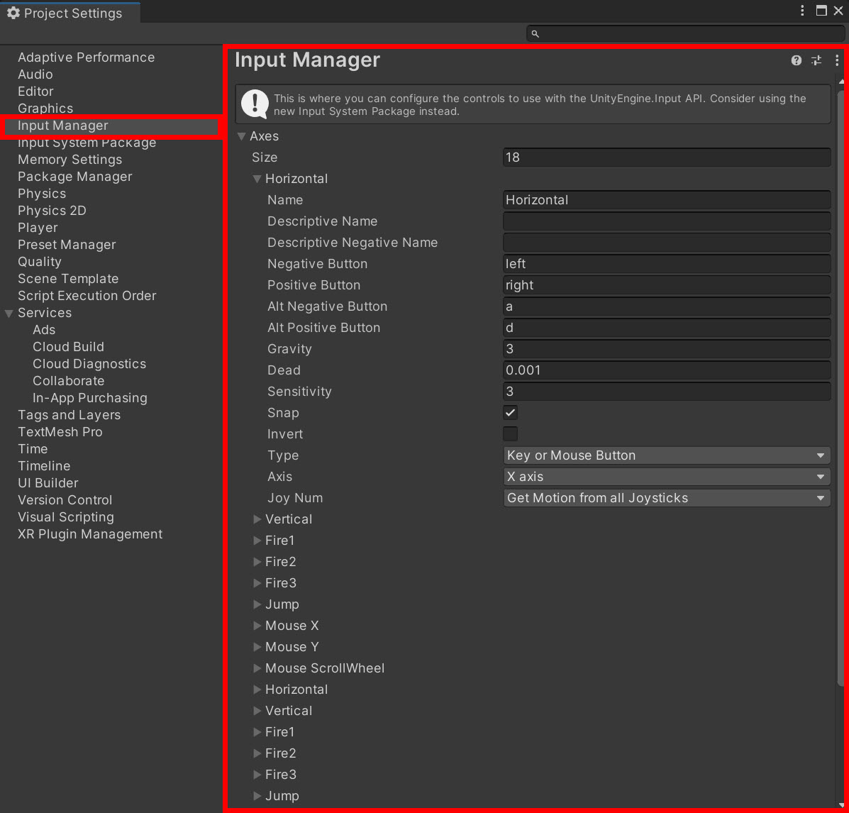 1)project settings에서 기존의 입력 관리자(input manager)가 활성화되어있는것을 확인할수있습니다.