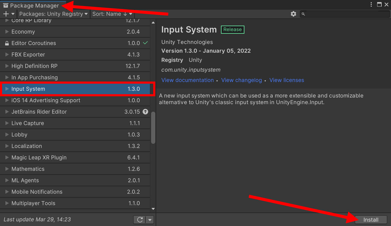 2)package manager의 상단에서 packages:unity registry를 선택하고 새로운 입력 시스템(input system)을 검색 및 설치합니다(install)