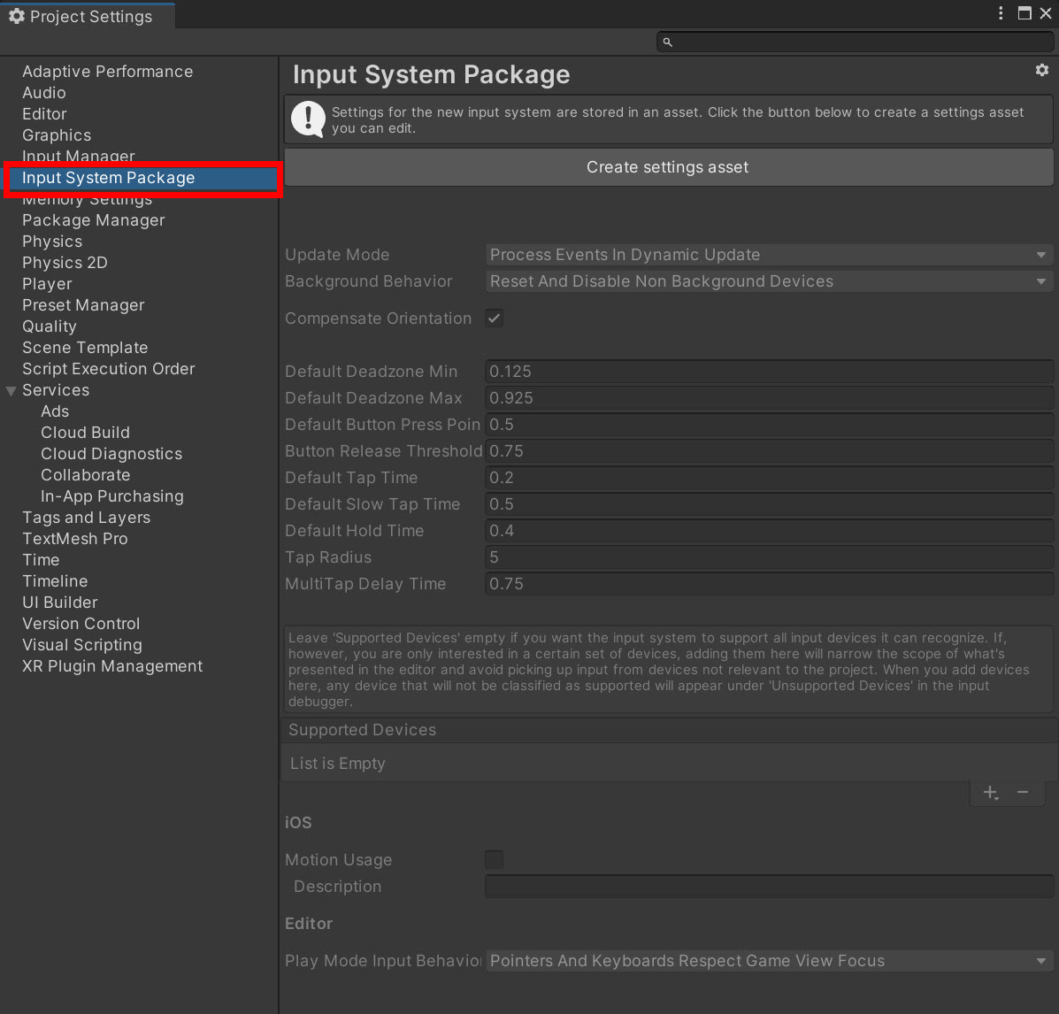 6)기존의 input manager가 비활성화된것을 확인할수있으며 새로운 입력 시스템을 사용할수있습니다.
