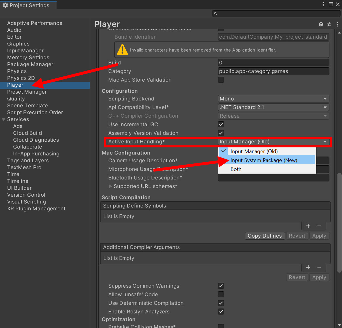 5)player의 other settings에서 active input handling을 input system package(new)로 변경하고 적용합니다(apply)