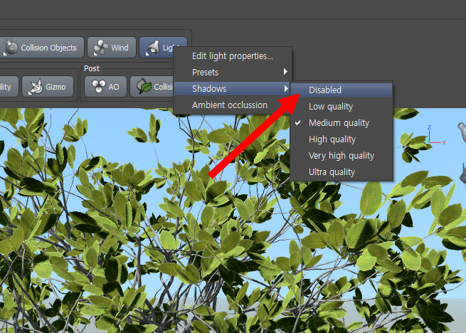 스피드트리(speedtree)에서 나무 그림자 비활성화하기