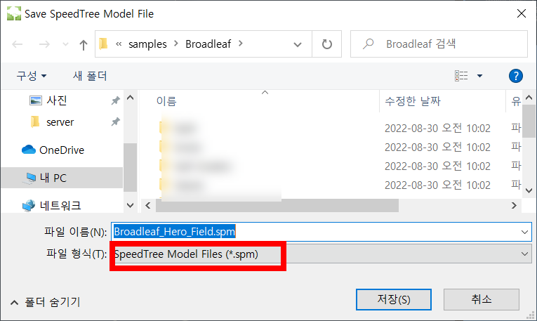 2)파일 이름을 설정하고 저장합니다. 스피드트리 저장 파일 형식은 spm(speedtree model)를 사용합니다.