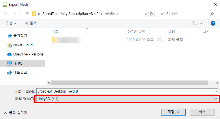 스피드트리 유니티 구독 에디션의 경우 내보내기(export) 파일 형식이 제한적이며 Unity 연동을 위한 파일형식(.st)을 지원합니다.