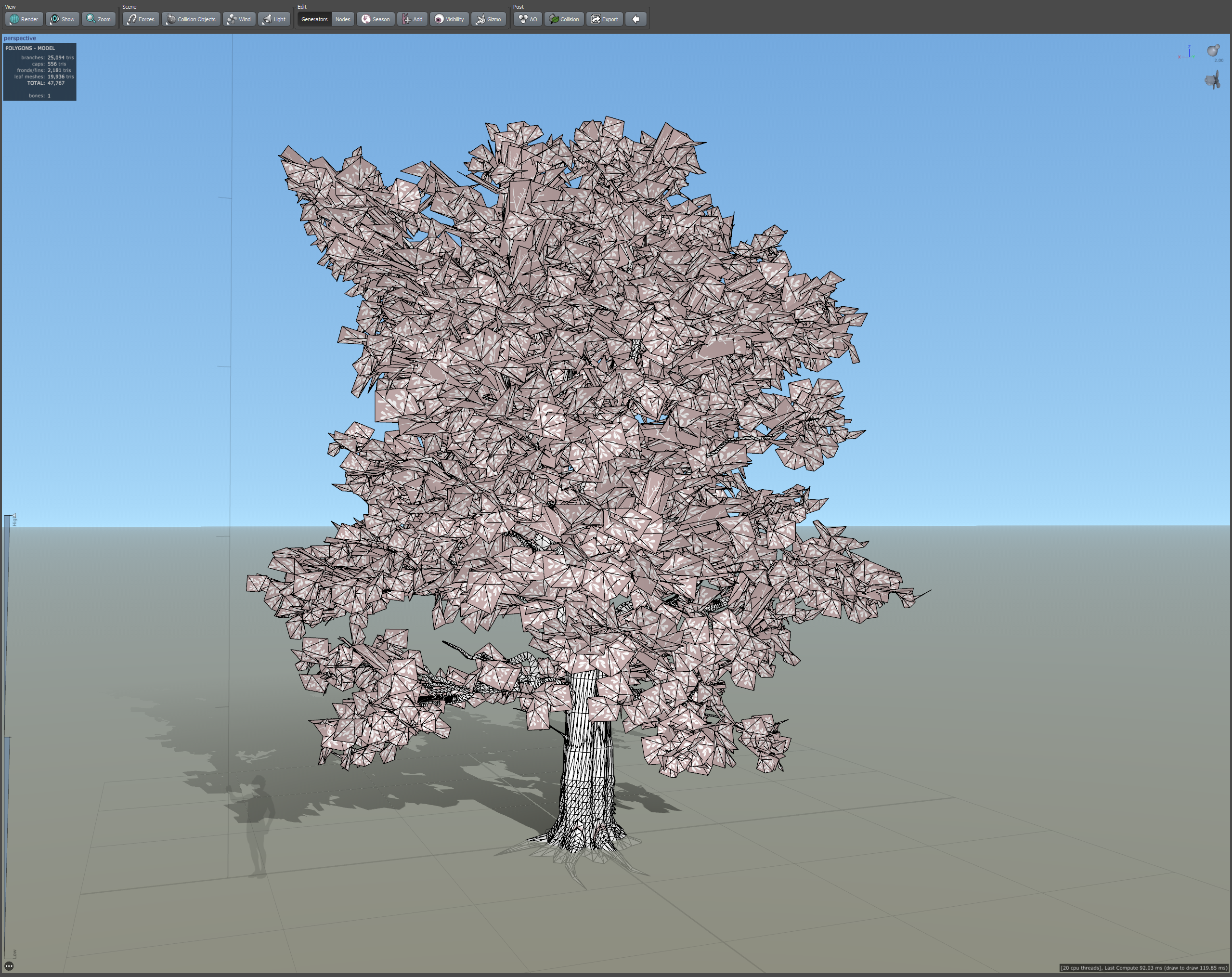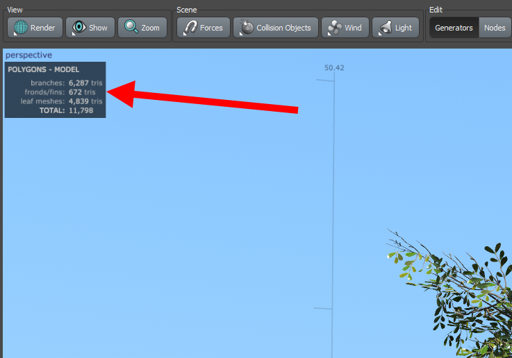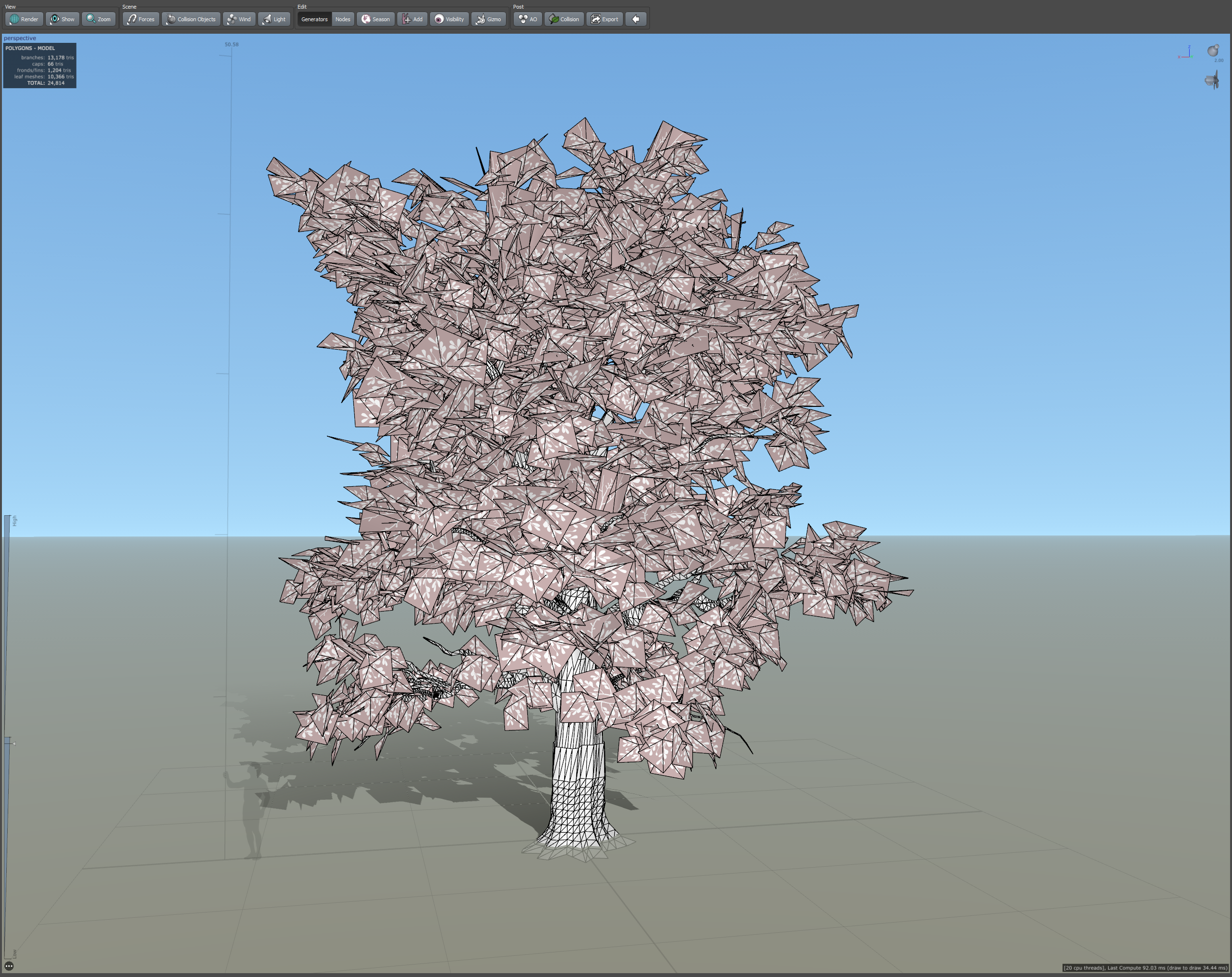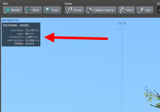 5)뷰포트의 좌측 상단에서 현재 모델의 폴리곤 개수를 확인할수있습니다. 나뭇가지, 나뭇잎등의 나무 구성요소에 대하여 폴리곤 개수를 표시합니다.
