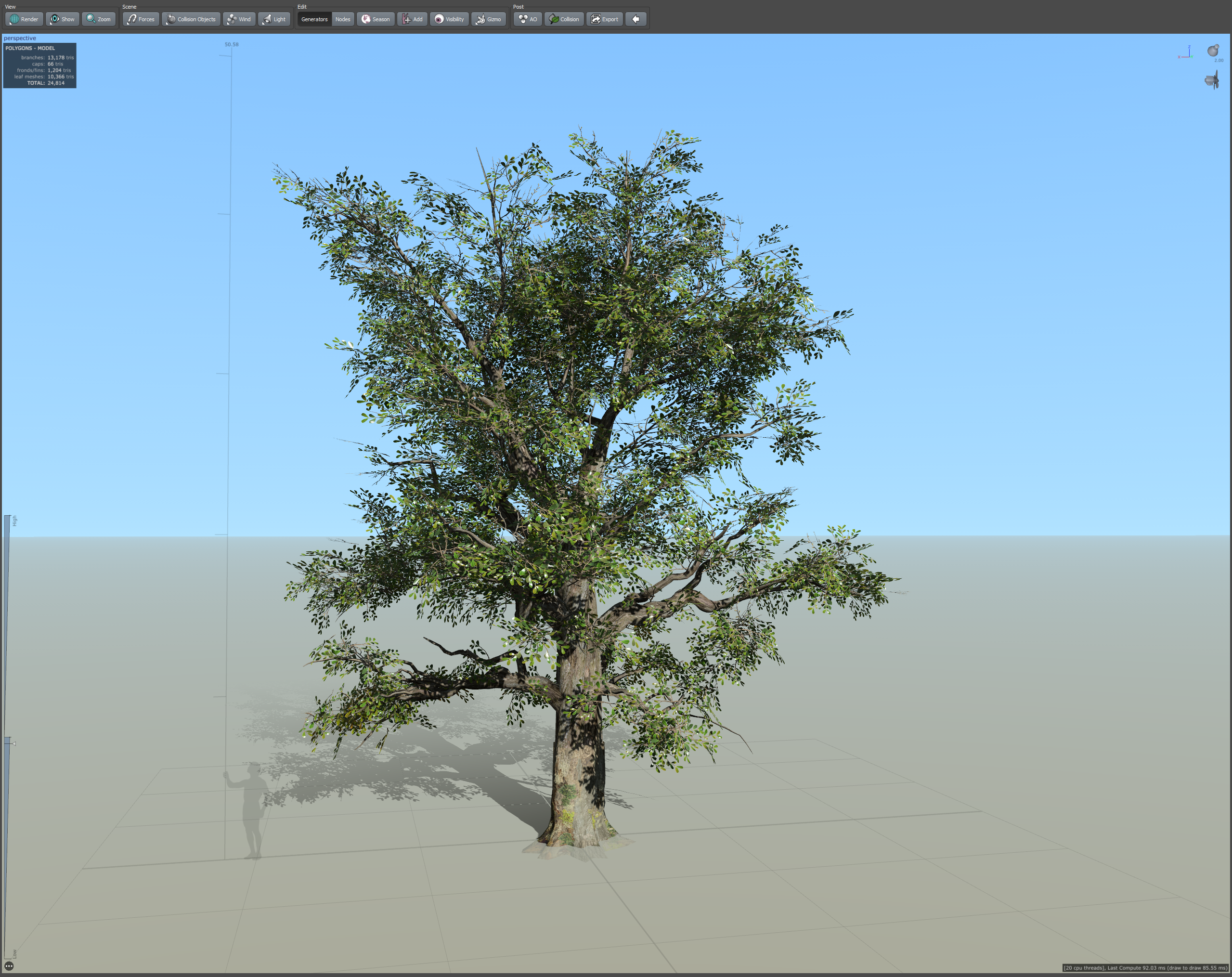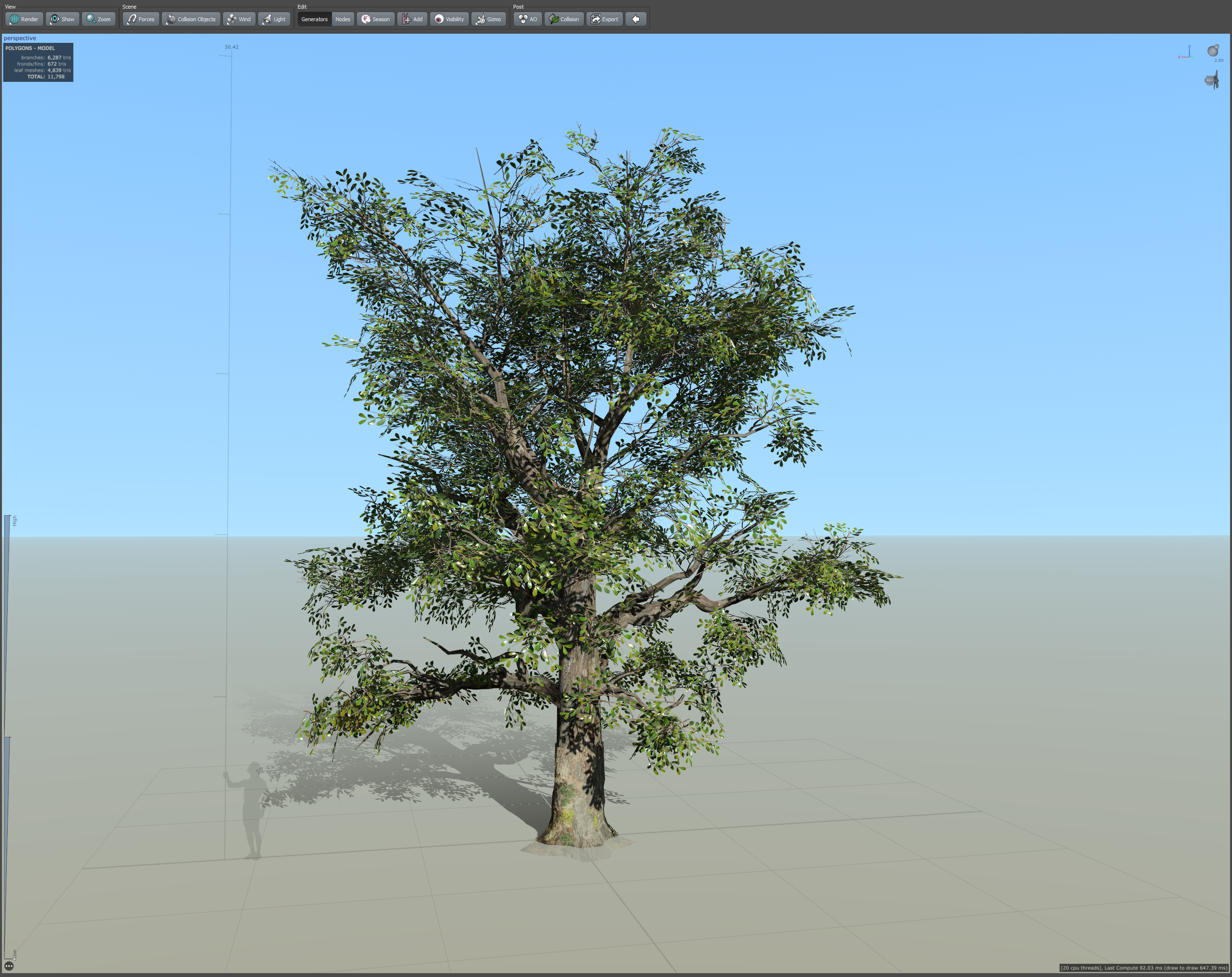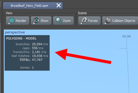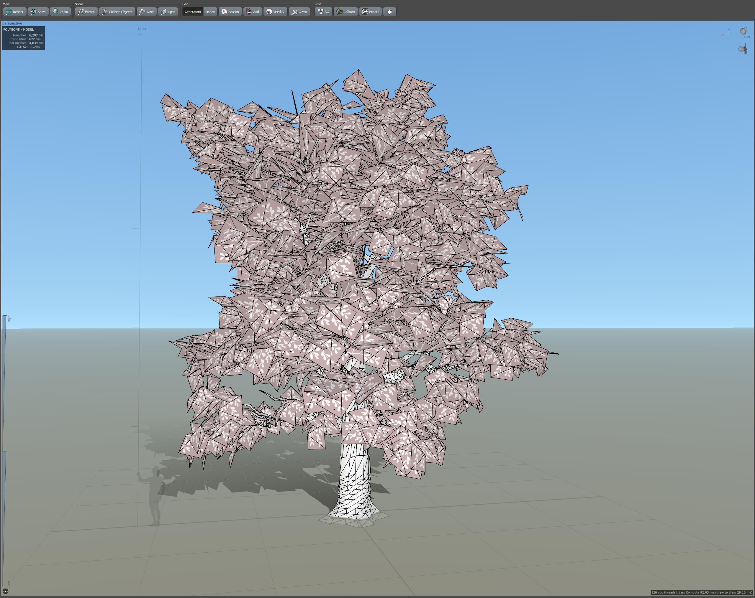 5)뷰포트의 좌측 상단에서 현재 모델의 폴리곤 개수를 확인할수있습니다. 나뭇가지, 나뭇잎등의 나무 구성요소에 대하여 폴리곤 개수를 표시합니다.