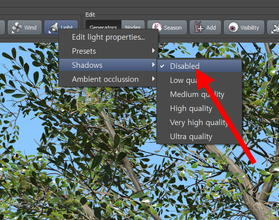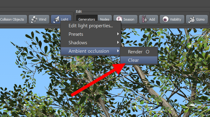 3)나무의 추가적인 음영처리기법(ambient occlussion)을 비활성화합니다(clear)