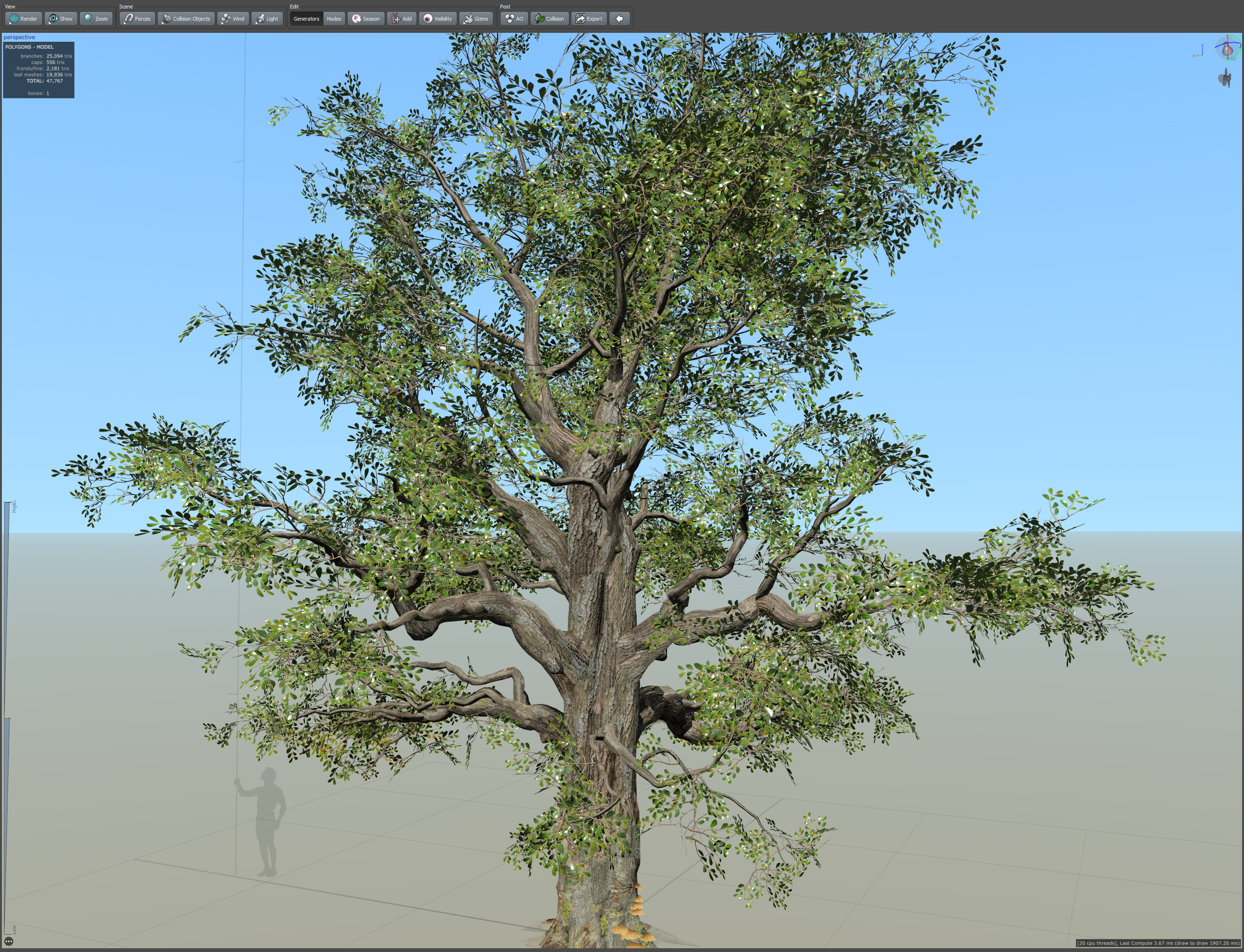 1)tree 윈도우의 뷰포트에서 현재 작업중인 3d 나무모델이 렌더링되어 표시되는것을 확인할수있습니다.