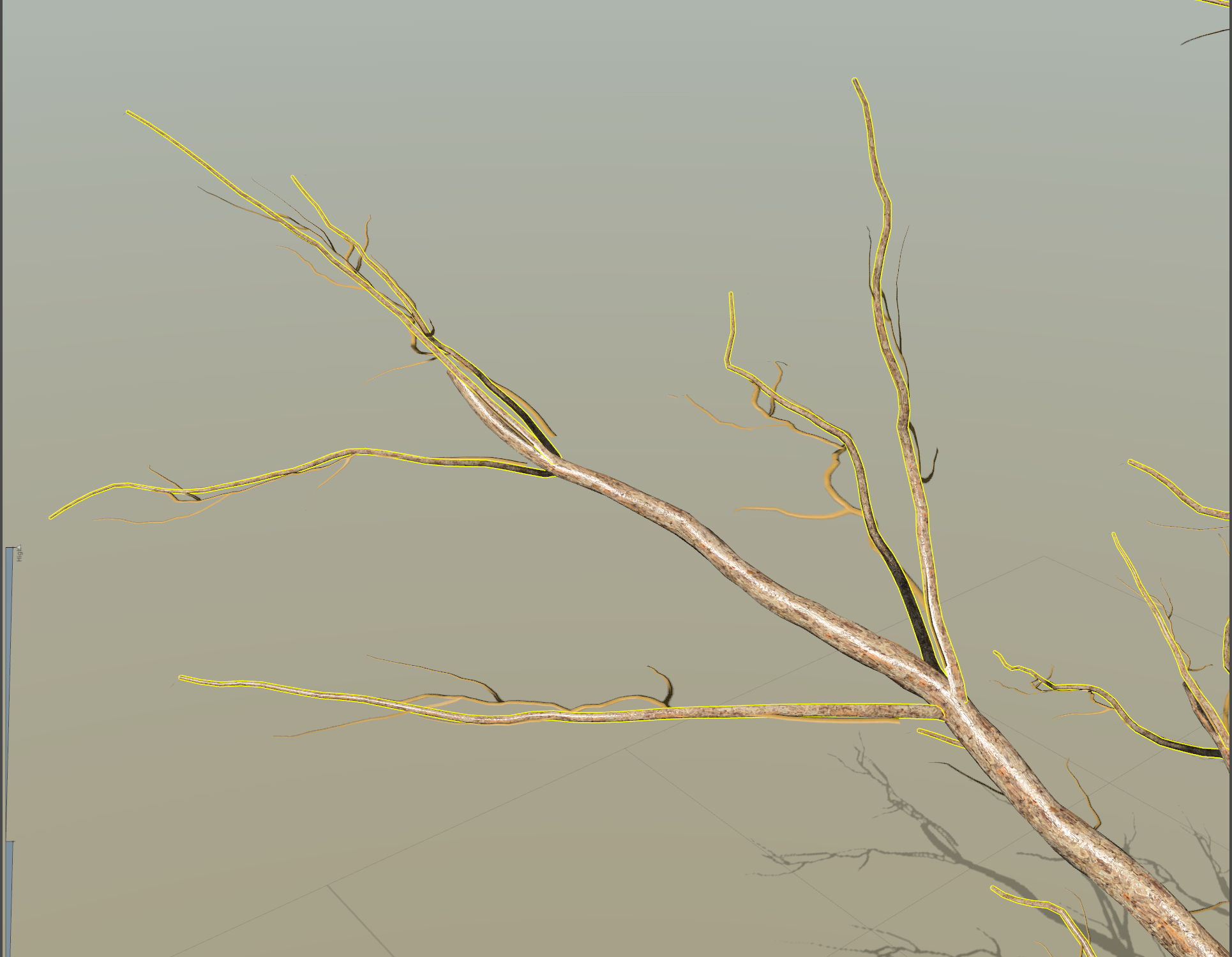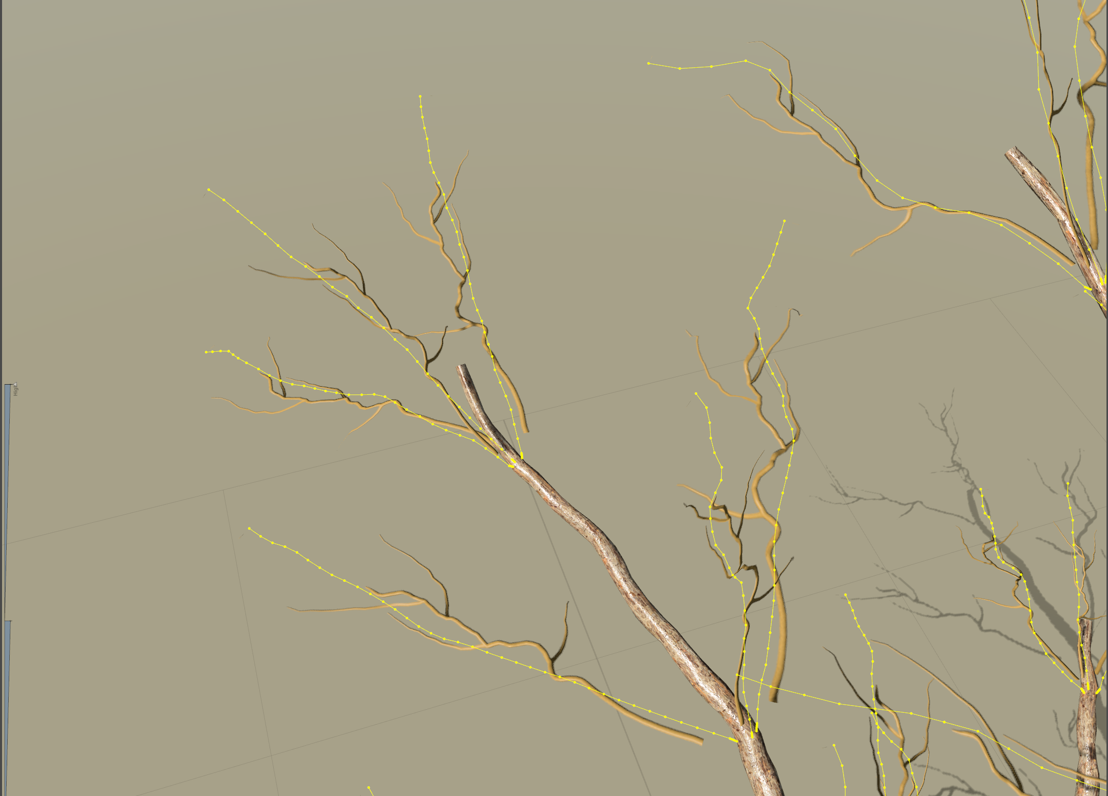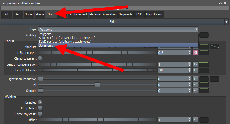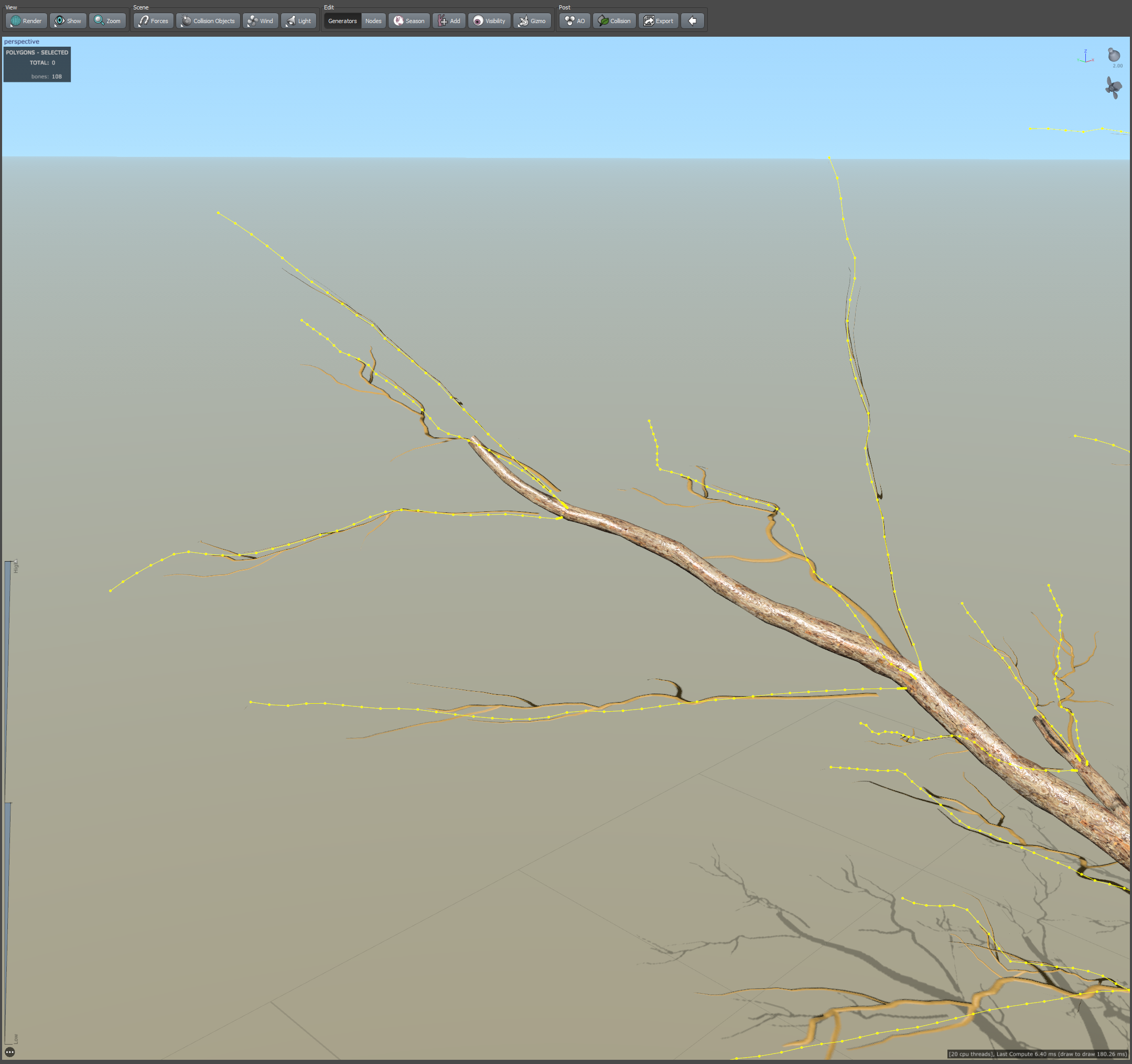 13)해당 노드가 스파인(spine) 유형의 제너레이터로 변경되며 나무 모델에서 메시(mesh) 대신 스파인(spine)이 표시되는것을 확인할수있습니다.