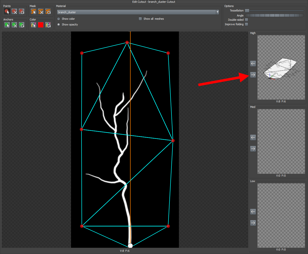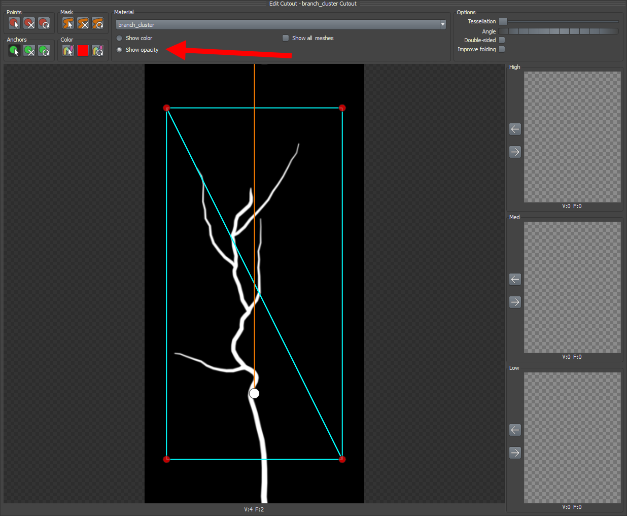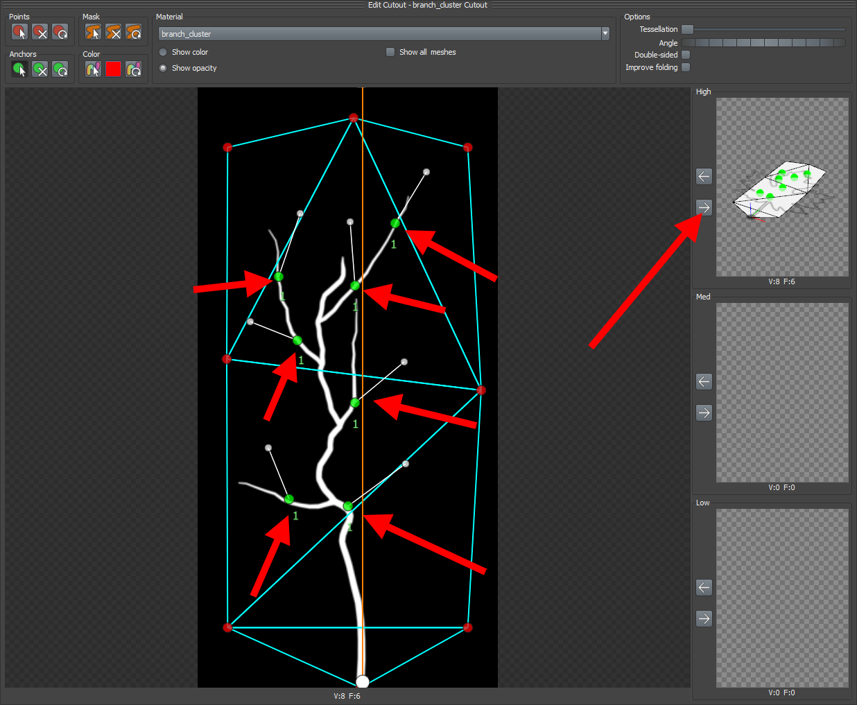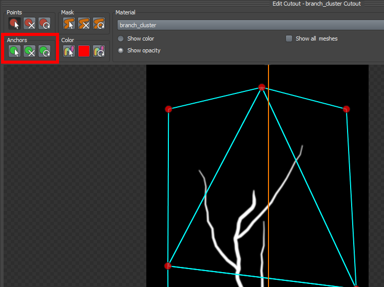 14)frond의 메시 편집에서 anchors는 frond의 하위에 leaf mesh를 추가할때 단위 leaf mesh가 위치하는 포인트를 의미합니다. anchors를 추가하여 나뭇가지 텍스처(cluster)를 사용하는 frond 메시에서 하위 나뭇잎 메시가 위치할 포인트를 설정합니다.