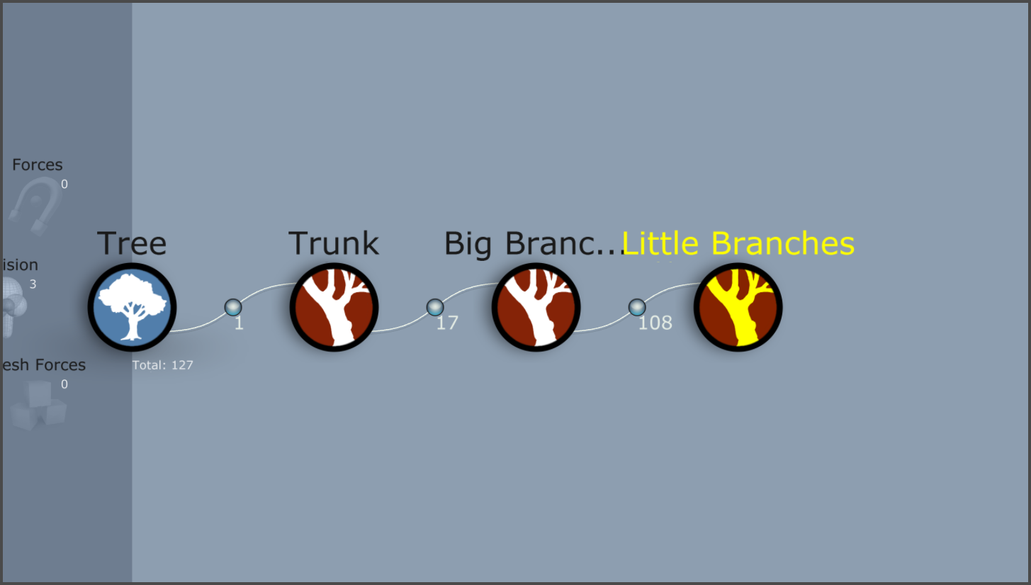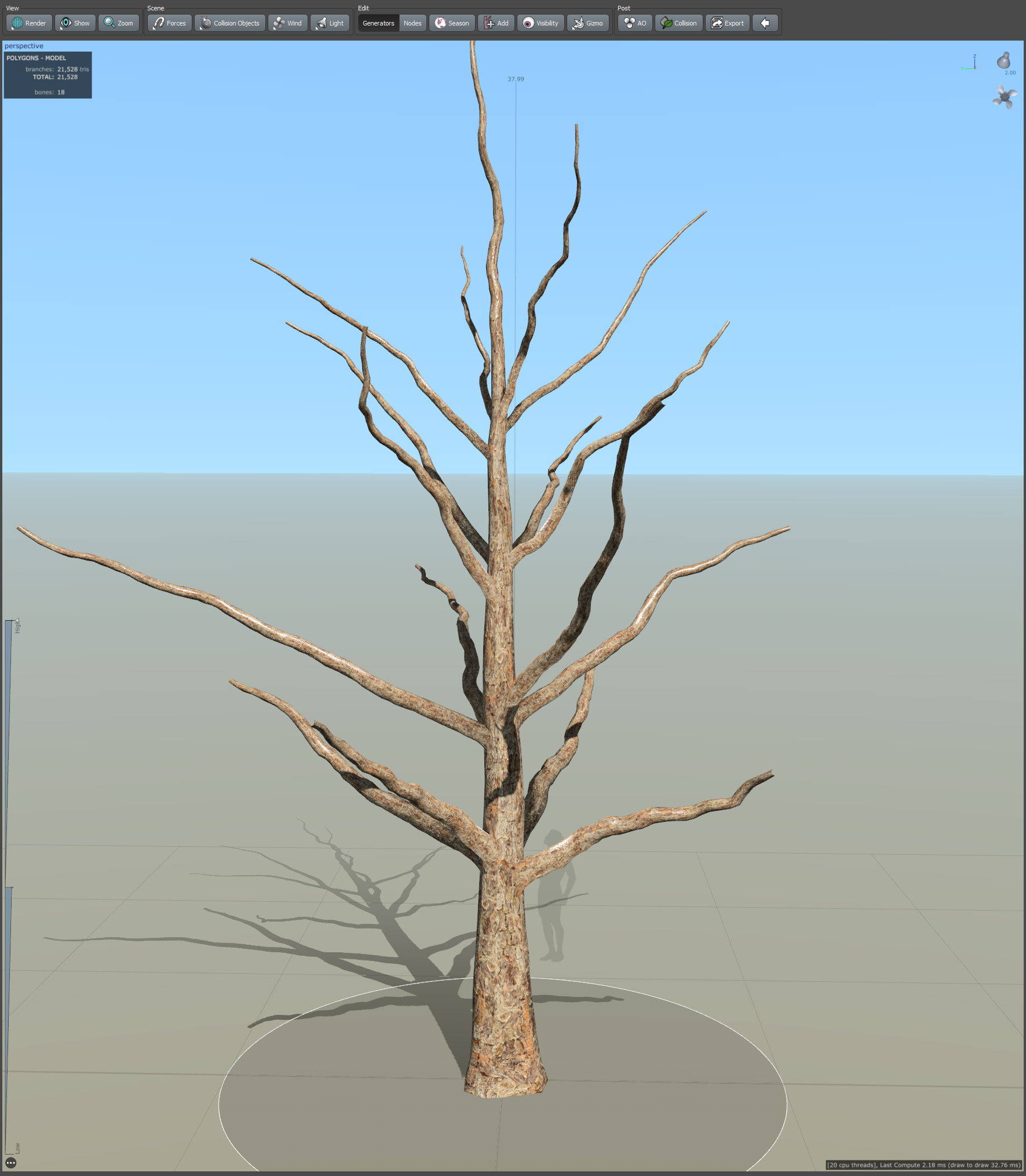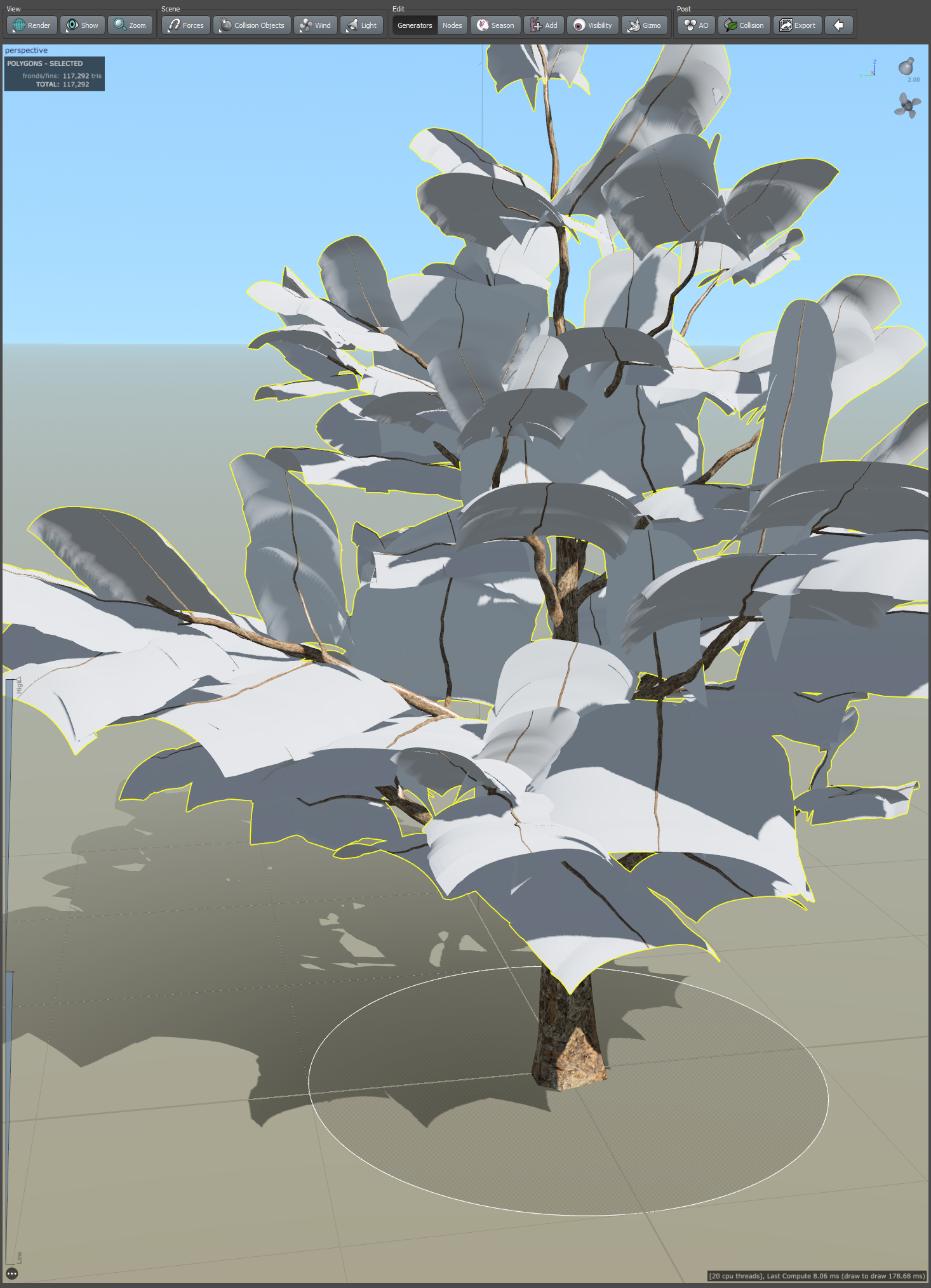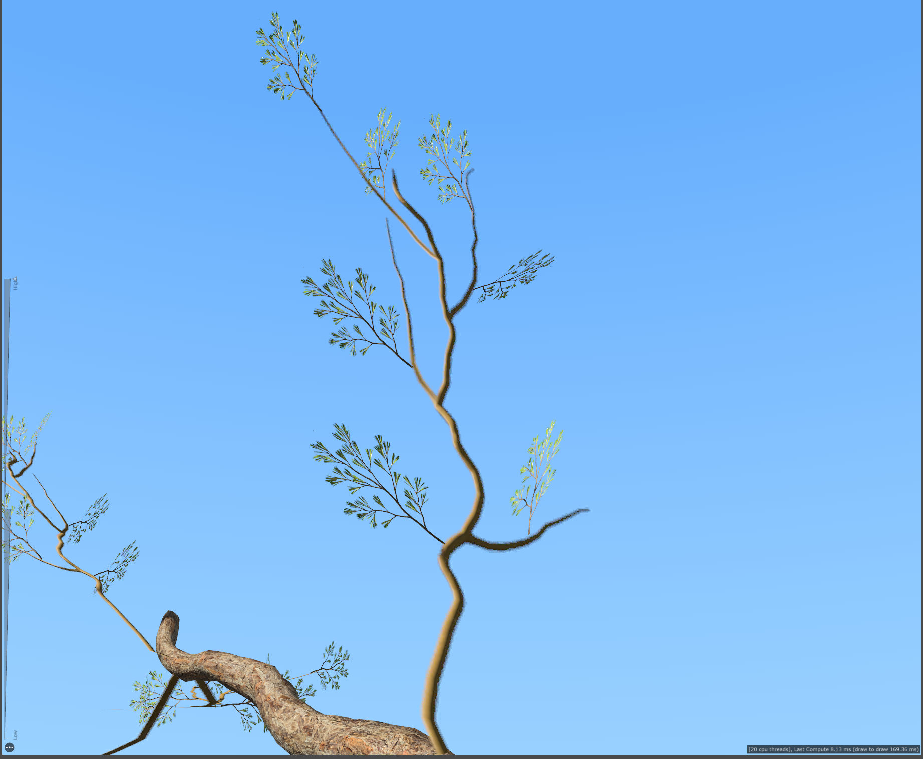 19)나무줄기의 나뭇가지에서 frond(나뭇가지 cluster)와 leaf mesh(나뭇잎 무리와 나뭇가지 cluster)가 추가된것을 확인할수있습니다.
