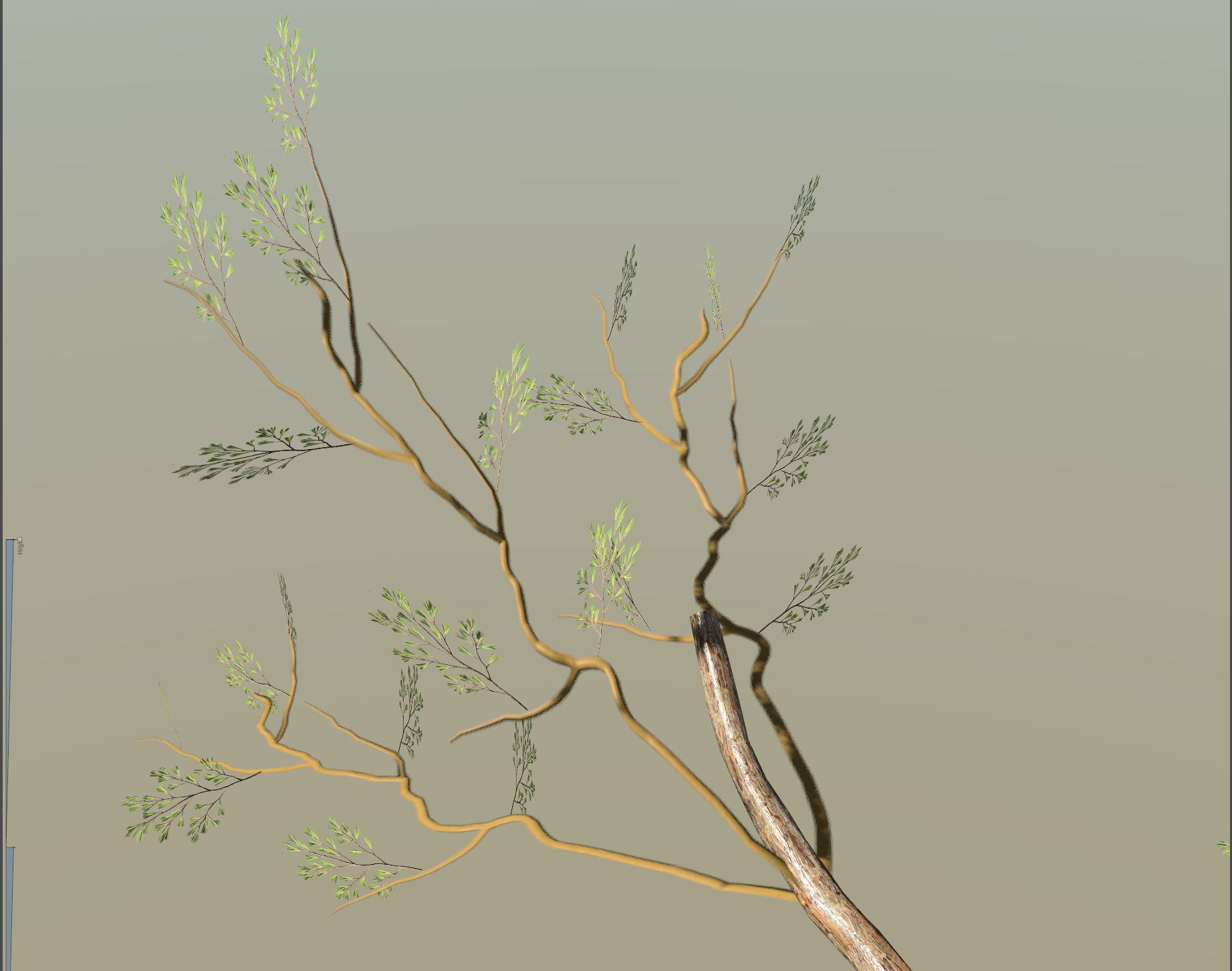 10)나뭇가지(little branches)의 위치에 해당 메시를 대체할수있는 fronds의 나뭇가지 텍스처(cluster)가 배치된것을 확인할수있습니다.