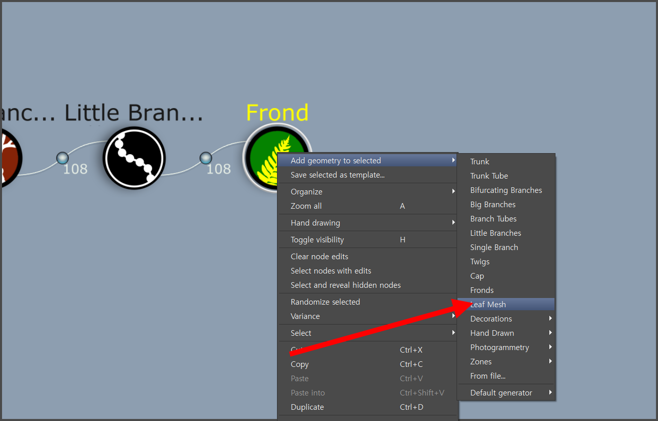 15)frond 노드에 leaf mesh 제너레이터를 추가합니다.