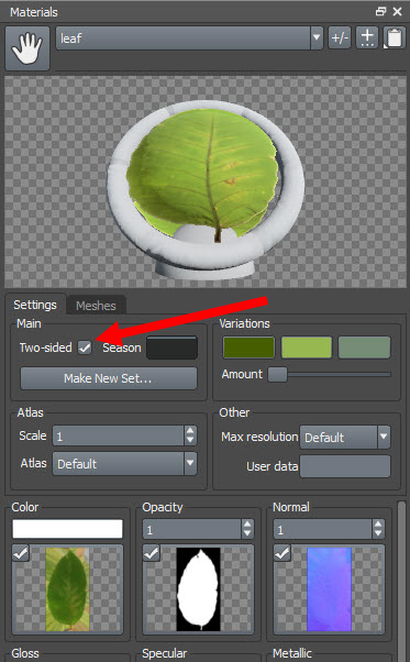 5)나뭇잎 재질의 two-sided 에 체크합니다.