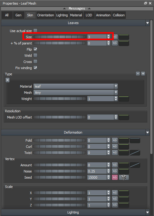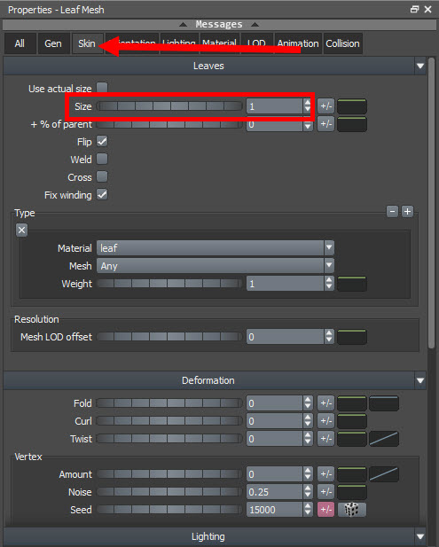 7)나뭇잎의 크기를 설정하려면 속성 윈도우에서 skin의 size를 설정합니다.