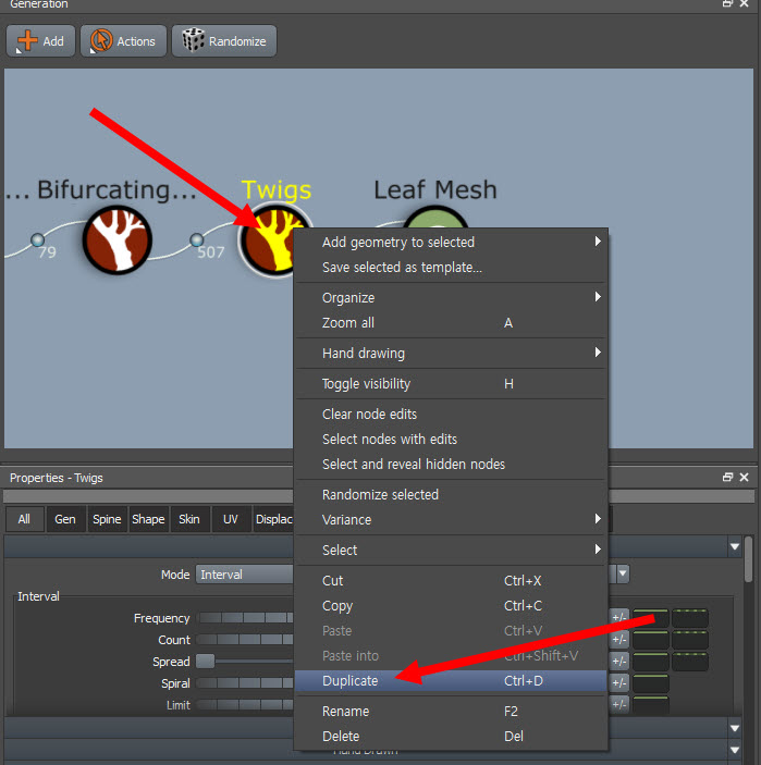 15)잔가지(twigs) 노드를 선택하고 마우스 우클릭한후 duplicate를 선택합니다(ctrl+d)