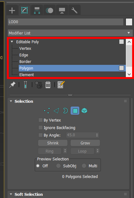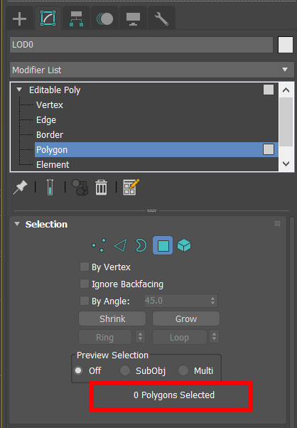 19)editable poly에서 선택한 폴리곤이 존재하지않는것을 확인할수있습니다( 0 polygons selected) 따라서 모델에 오각형이 존재하지않는것을 확인할수있습니다.