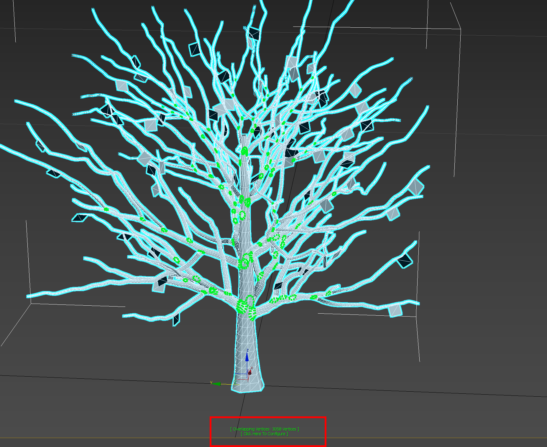 7)스피드트리에서 모델의 와이어프레임을 표시하면 나뭇가지의 아래 부분에 메시가 추가적으로 존재하는것을 확인할수있습니다.