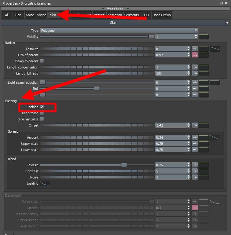 8)속성 윈도우에서 skin의 welding으로 이동합니다. enabled에 체크되어있는것을 확인할수있습니다.