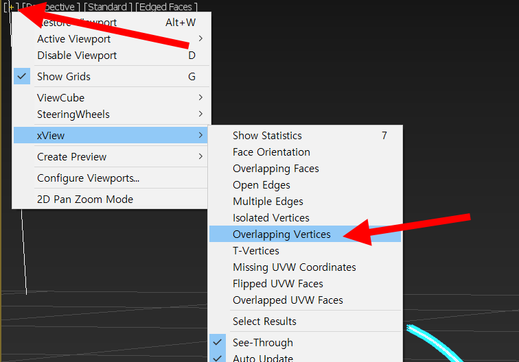 2)뷰포트의 좌측 상단에서 +를 클릭하고 xView의 overlapping vertices에 체크합니다.