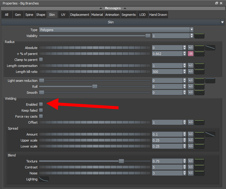 9)enabled에 체크해제합니다(이 설정은 나뭇가지의 생성과 형태에 영향을 미칩니다)