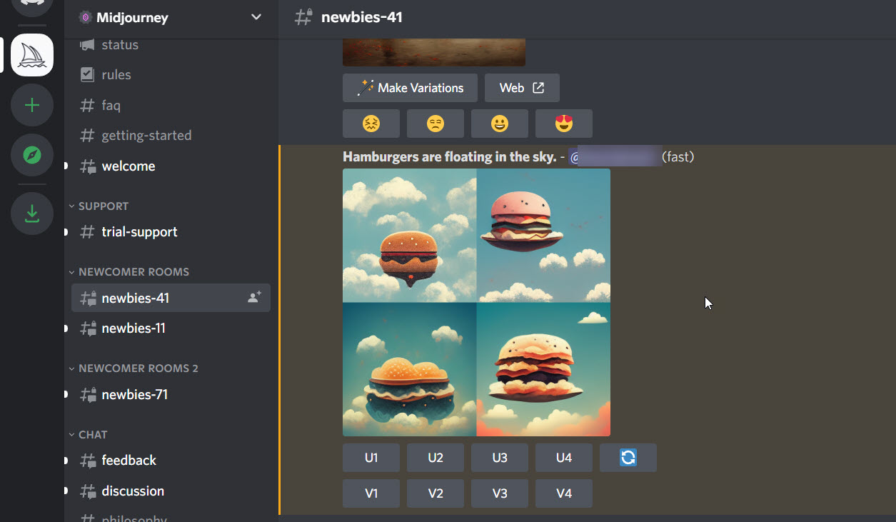 In the top row: U1, U2, U3, and U4 are buttons for Upscaling your chosen image. Upscaling an image generates a larger roughly 1024x1024 pixel version of the selected image. By default, this will also generate additional details.