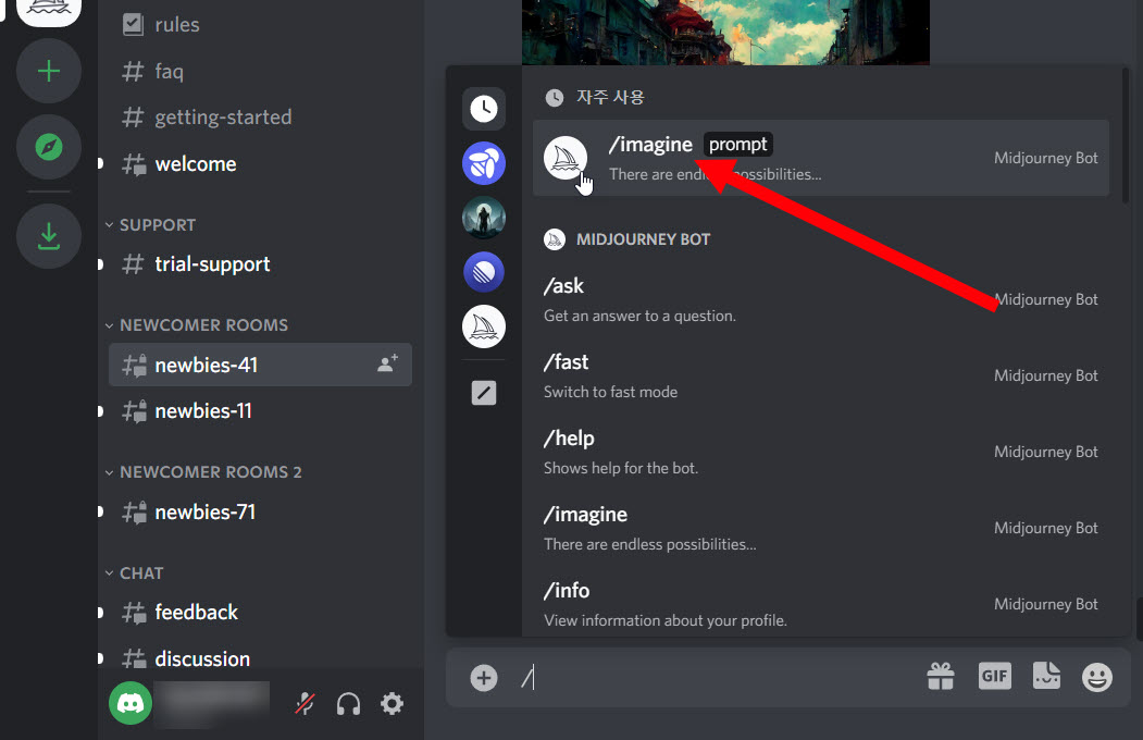 4)빗금 명령어 사용에서 /imagine을 선택한다.