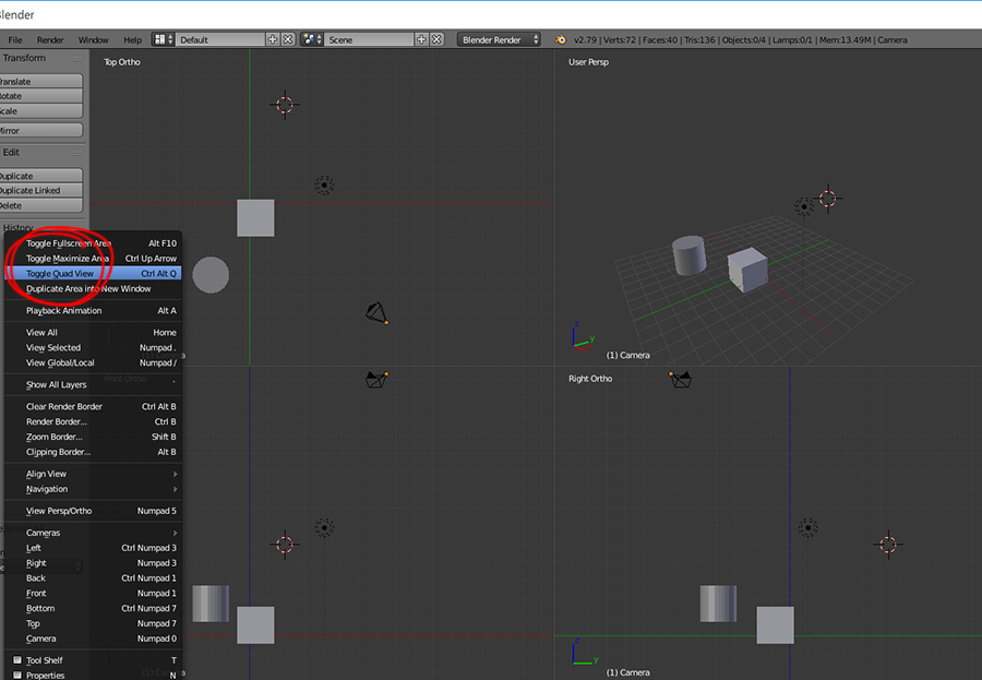 15)네개의 뷰(쿼드뷰)를 사용하려면 view 메뉴에서 toggle quad view를 선택합니다.
