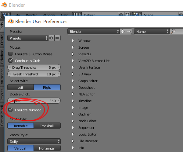 14)키보드 우측 numpad 대신에 키보드 상단 숫자패드를 사용하려면 user preferences에서 emulate numpad에 체크합니다.