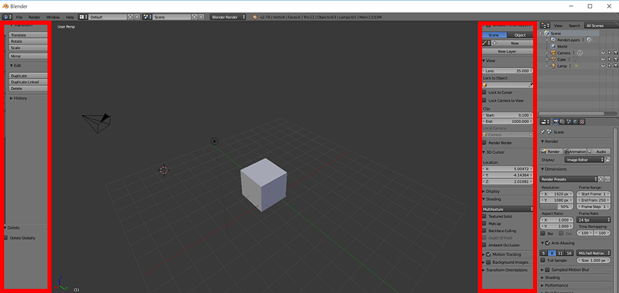 5)3D view의 좌측에는 tool shelf, 우측에는 properties 패널이 위치합니다.