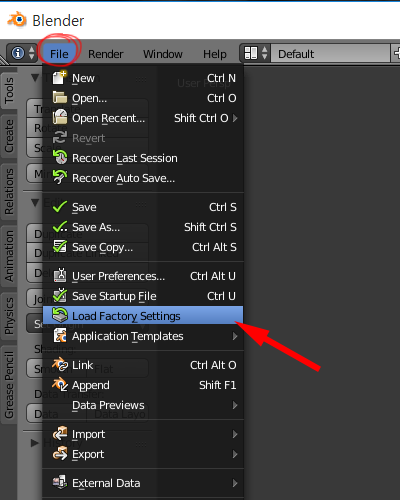 18)사용자가 변경한 설정에 대해서 다시 블렌더의 기본 설정으로 초기화하려면 상단의 file 메뉴에서 load factory settings를 선택합니다.