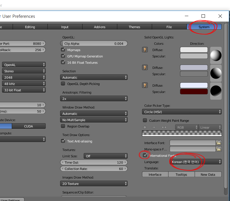 17)폴더 및 파일찾기에서 한글이름을 표시하려면 preferences의 system탭에서 international fonts에 체크하고 한국어를 선택합니다.