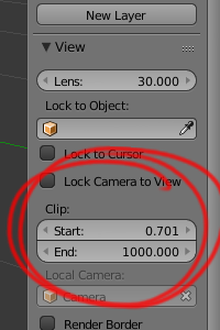 2)properties 패널에서 view의 clip은 카메라 클리핑의 시작과 끝(start, end)을 설정합니다. start의 수치를 감소시킵니다.