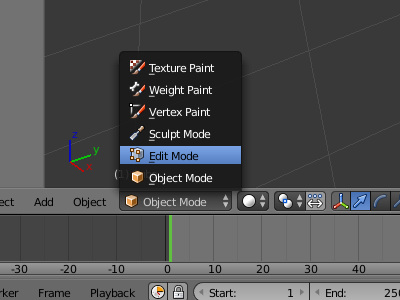1)오브젝트를 선택하고 3dview의 하단에서 edit mode를 선택합니다(단축키 tab)
