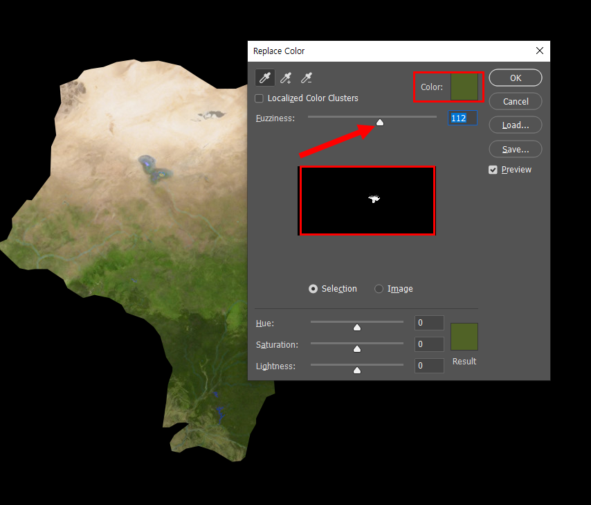 4)color에서 선택한 색상을 확인할수있습니다. fuzziness 수치를 조절하여 미리보기를 확인하면서 영역을 설정합니다.