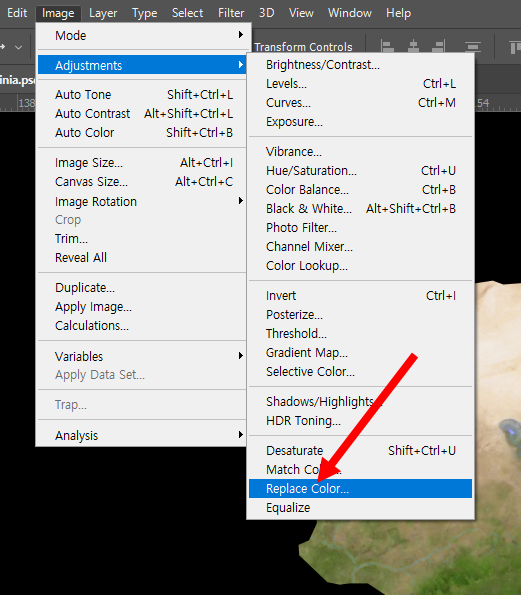 2)상단의 image 메뉴에서 adjustments의 replace color로 이동합니다.